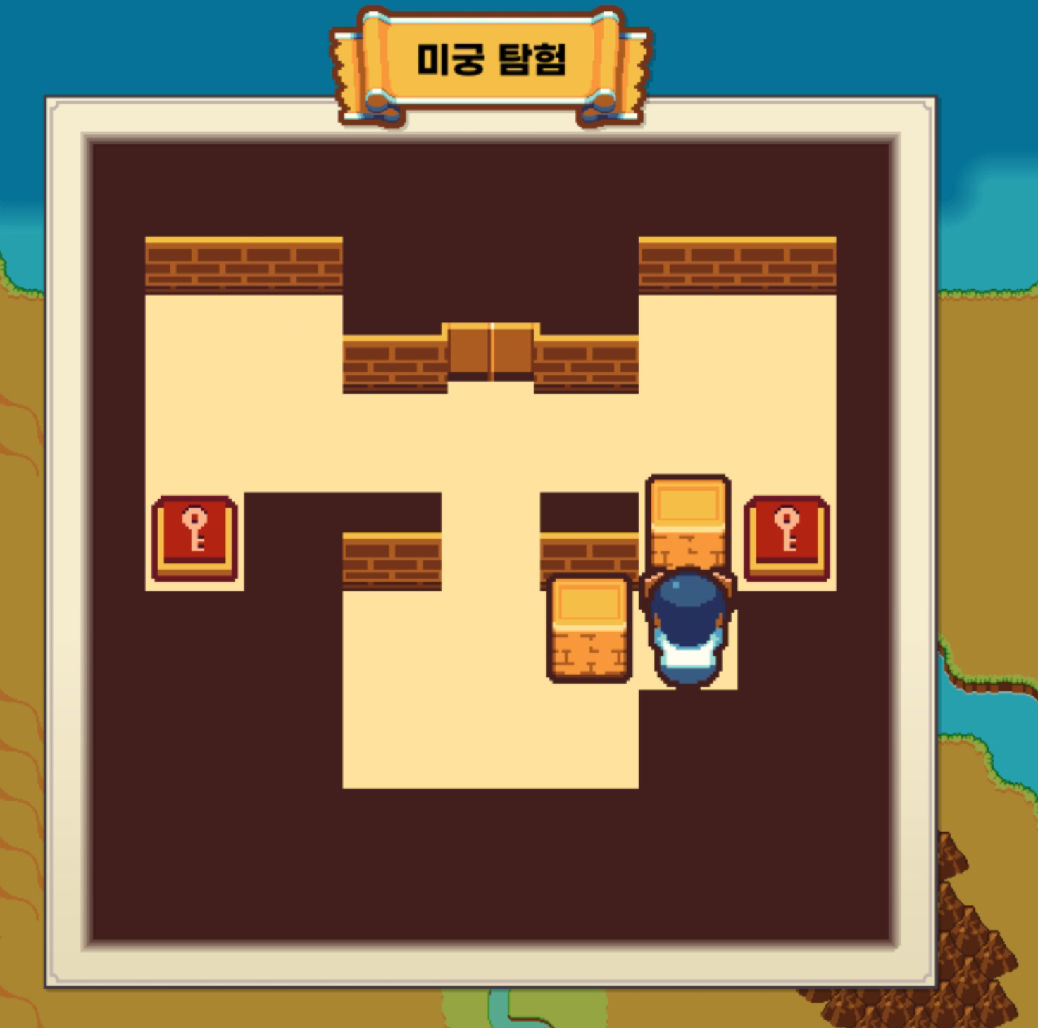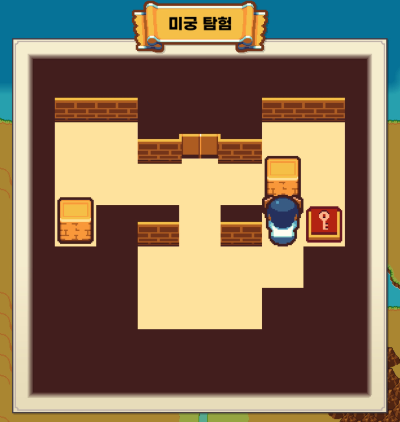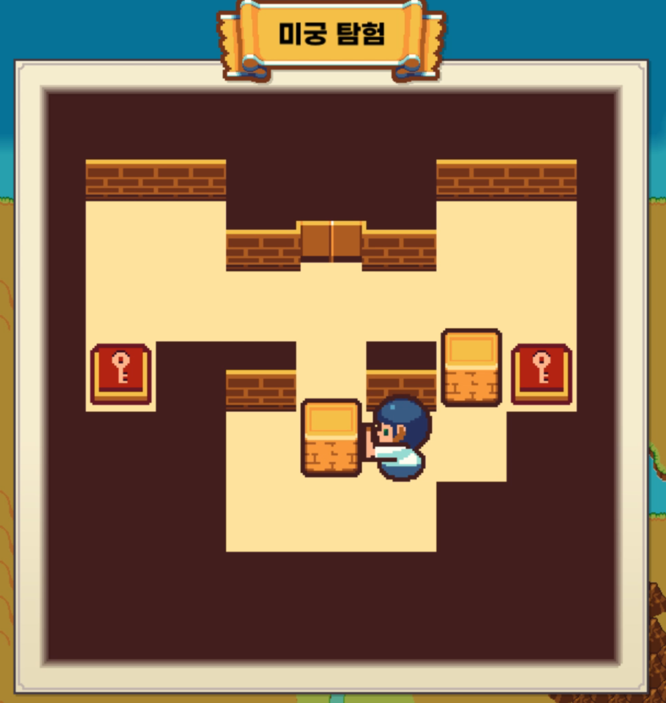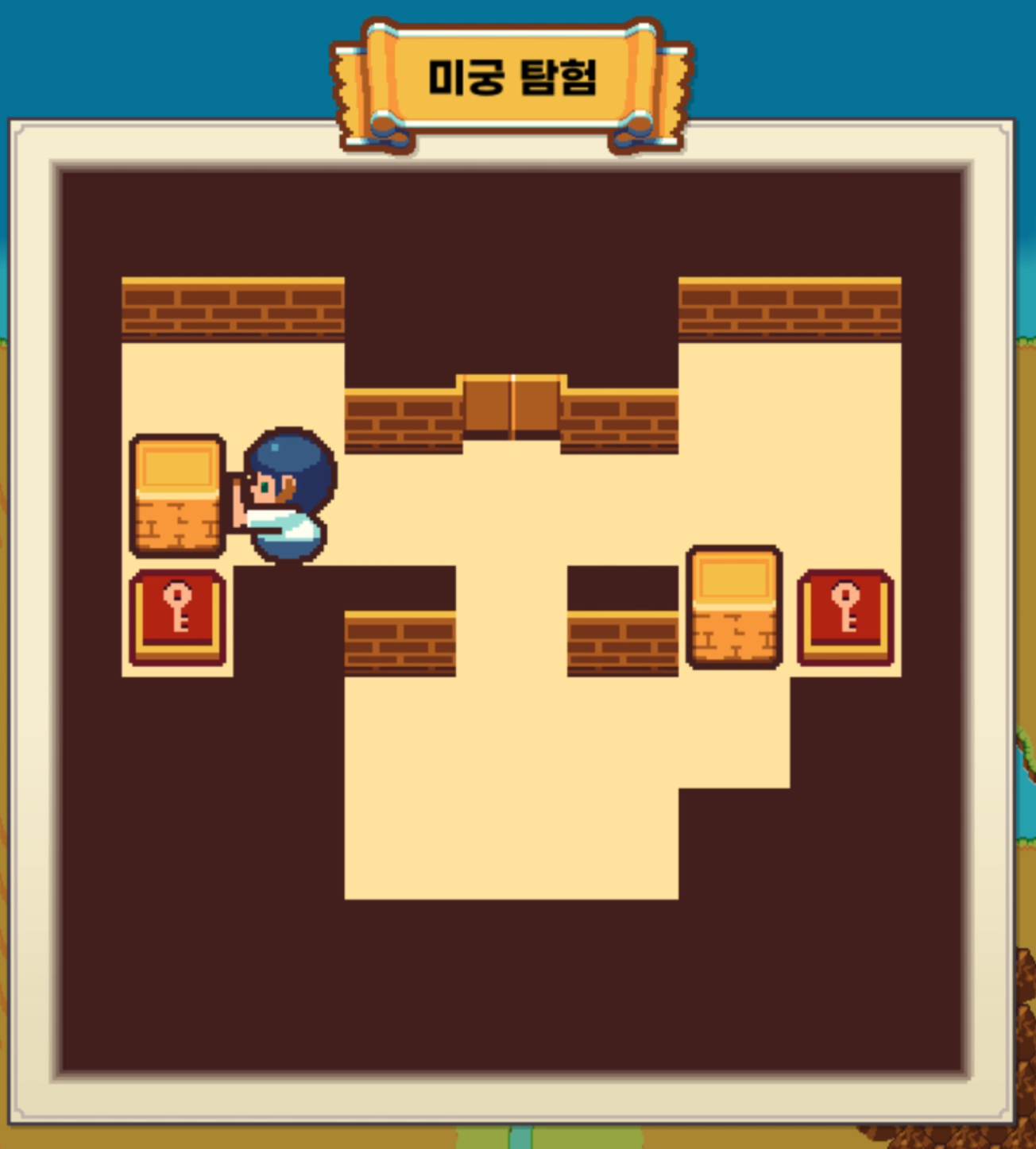상자를 밀어 열쇠 모양 바닥 위에 올리면 문이 열리고 해당 문으로 탈출하면 된다.