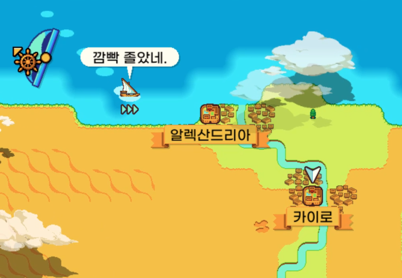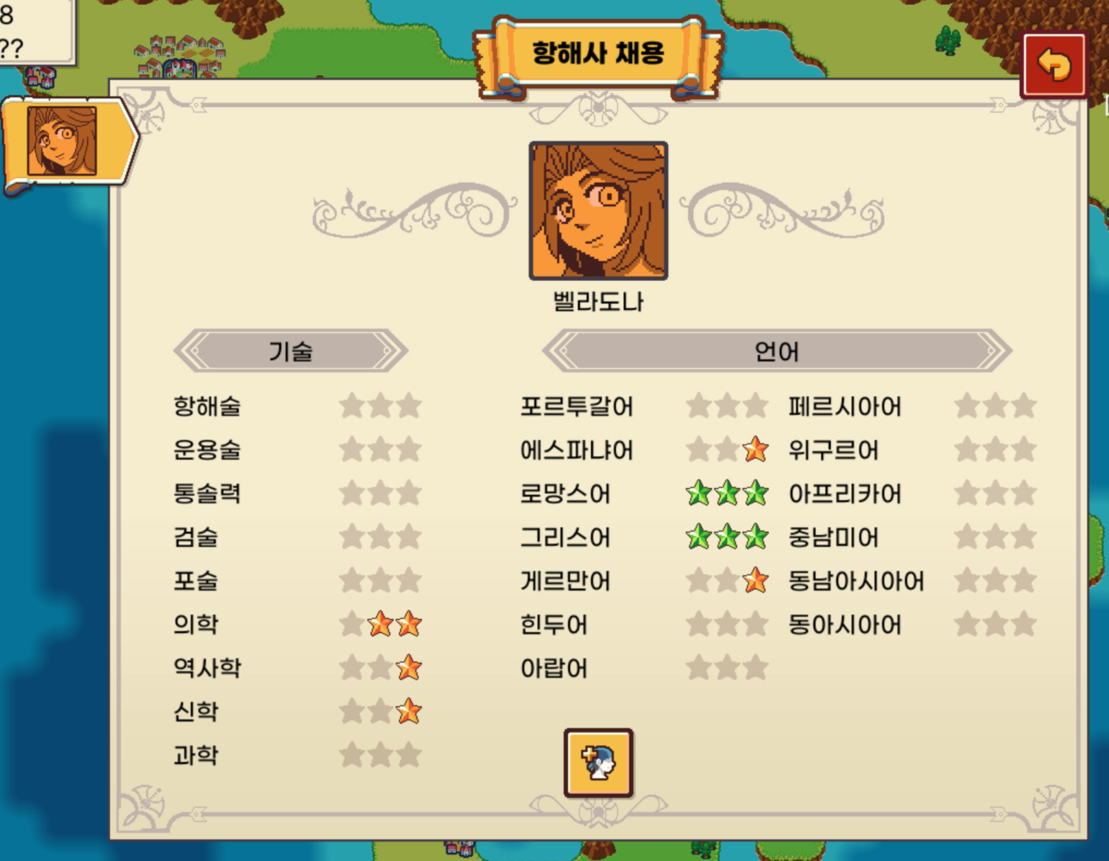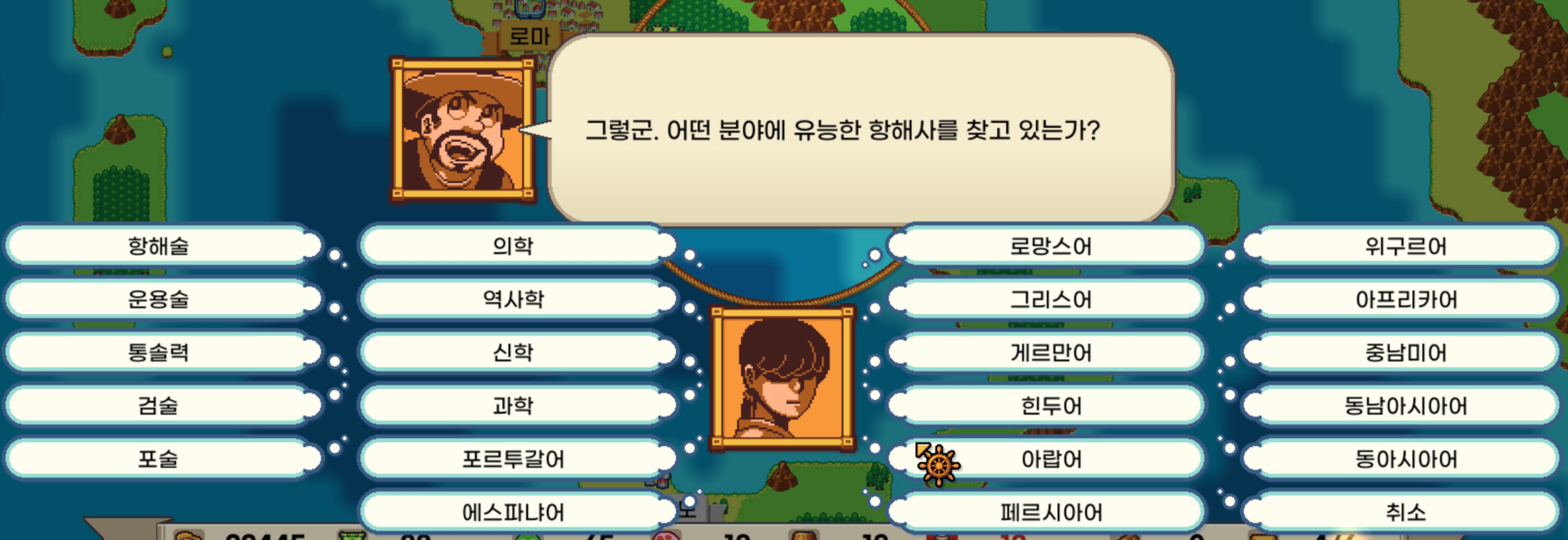 원하는 스킬을 선택하면 해당 스킬에 뛰어난 항해사가 어느 도시에 있는지 가르쳐준다.