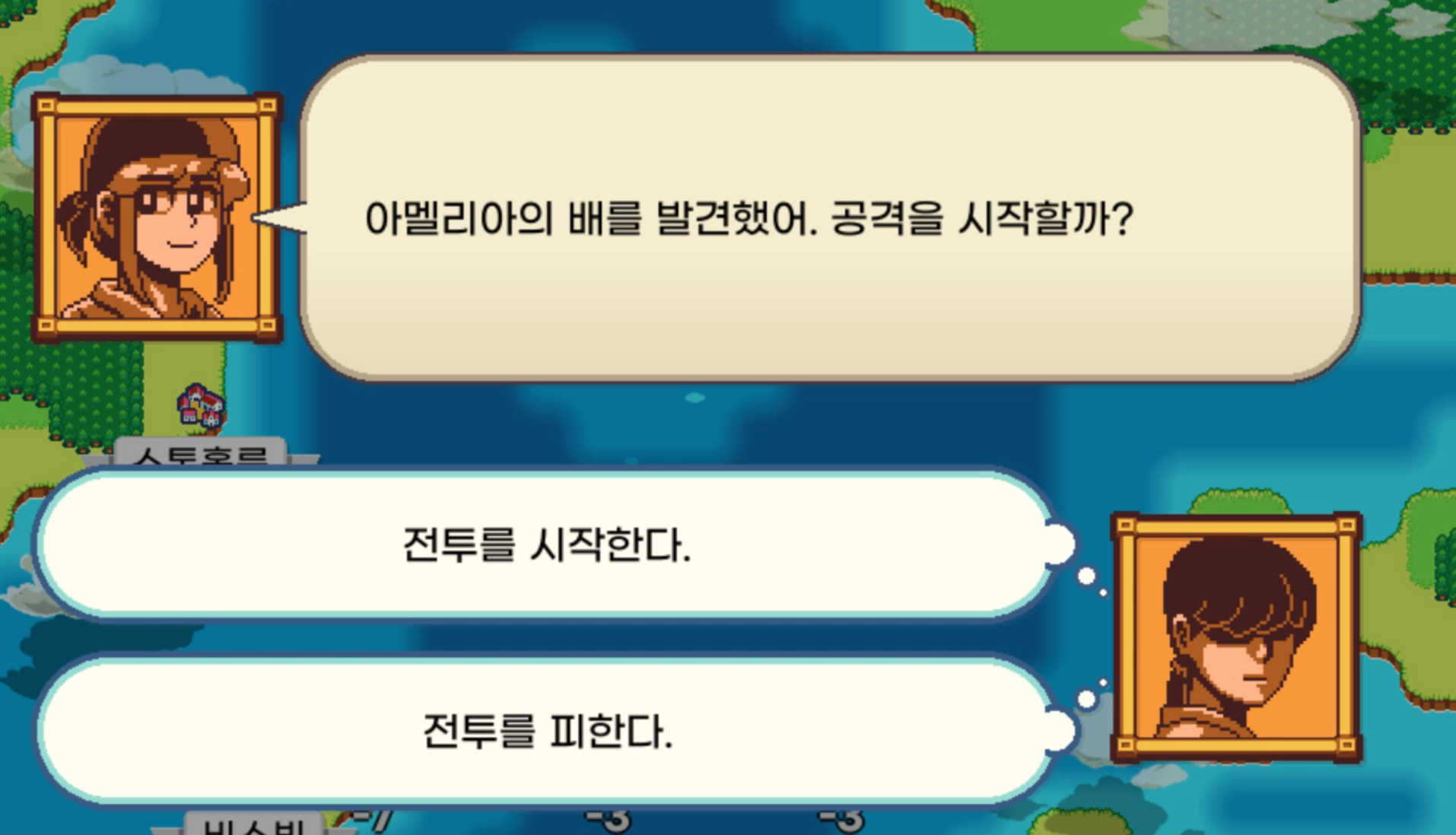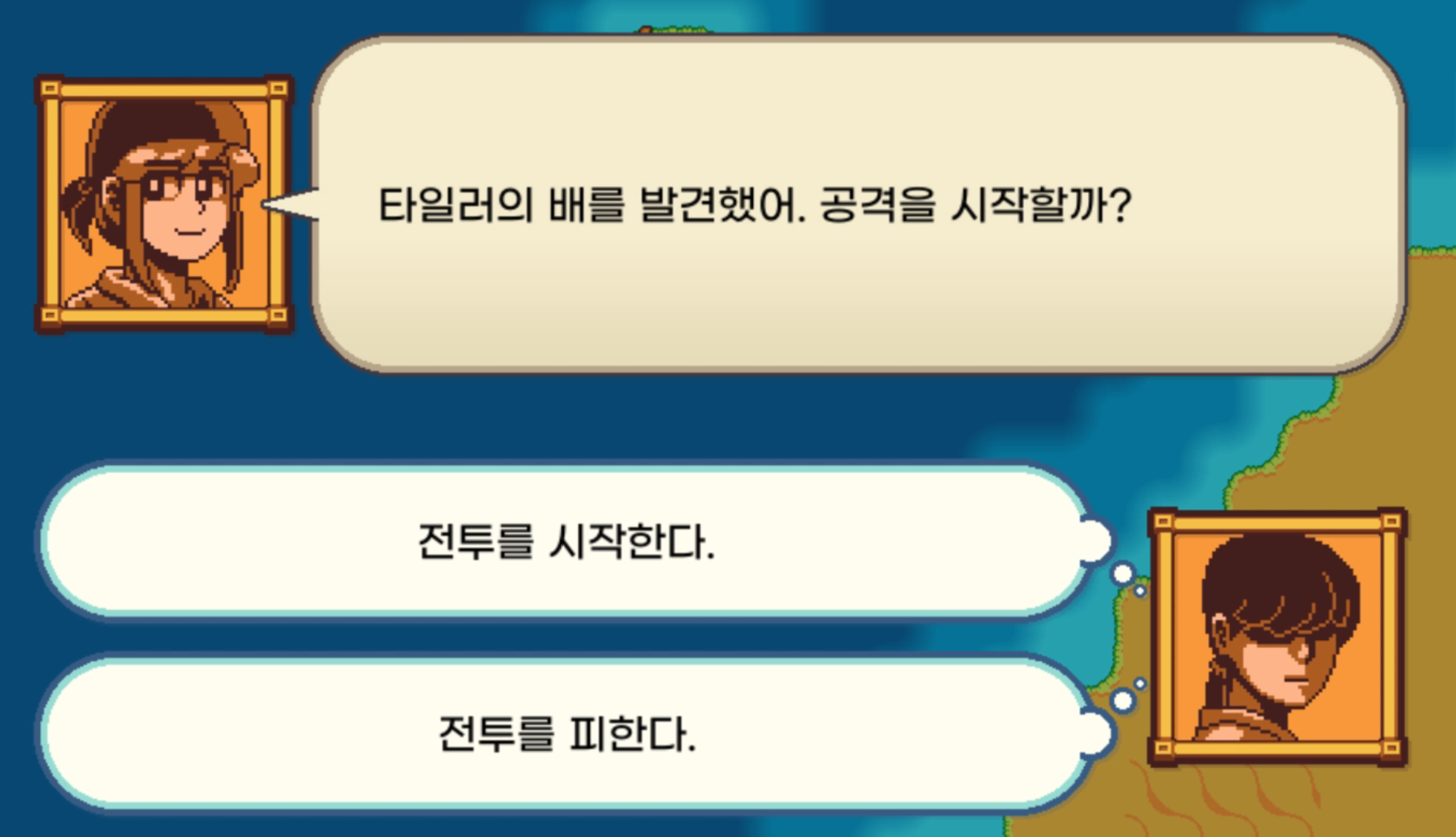 붉은색 사각형으로 표시한 배에 접근하면 대화 이후 전투가 시작된다.