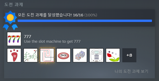 - 슬롯 머신 미니게임에서 한 번이라도 승리하기. 이길 때까지 계속 돌리면 된다.
