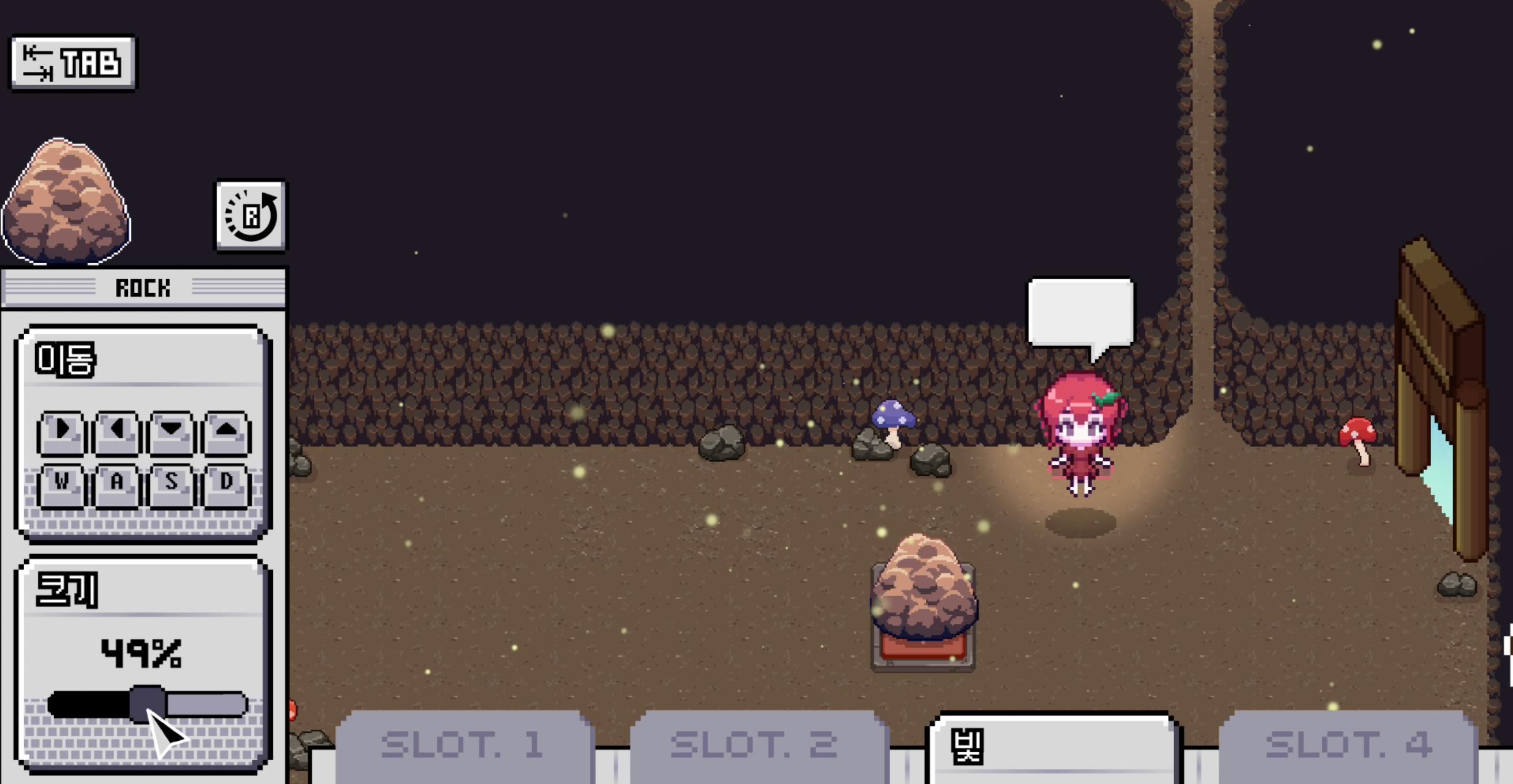 요정에게 빛 블록을 장착해 밝기를 올려주면 어둠 속에 가려져 있던 바위가 나타난다.
