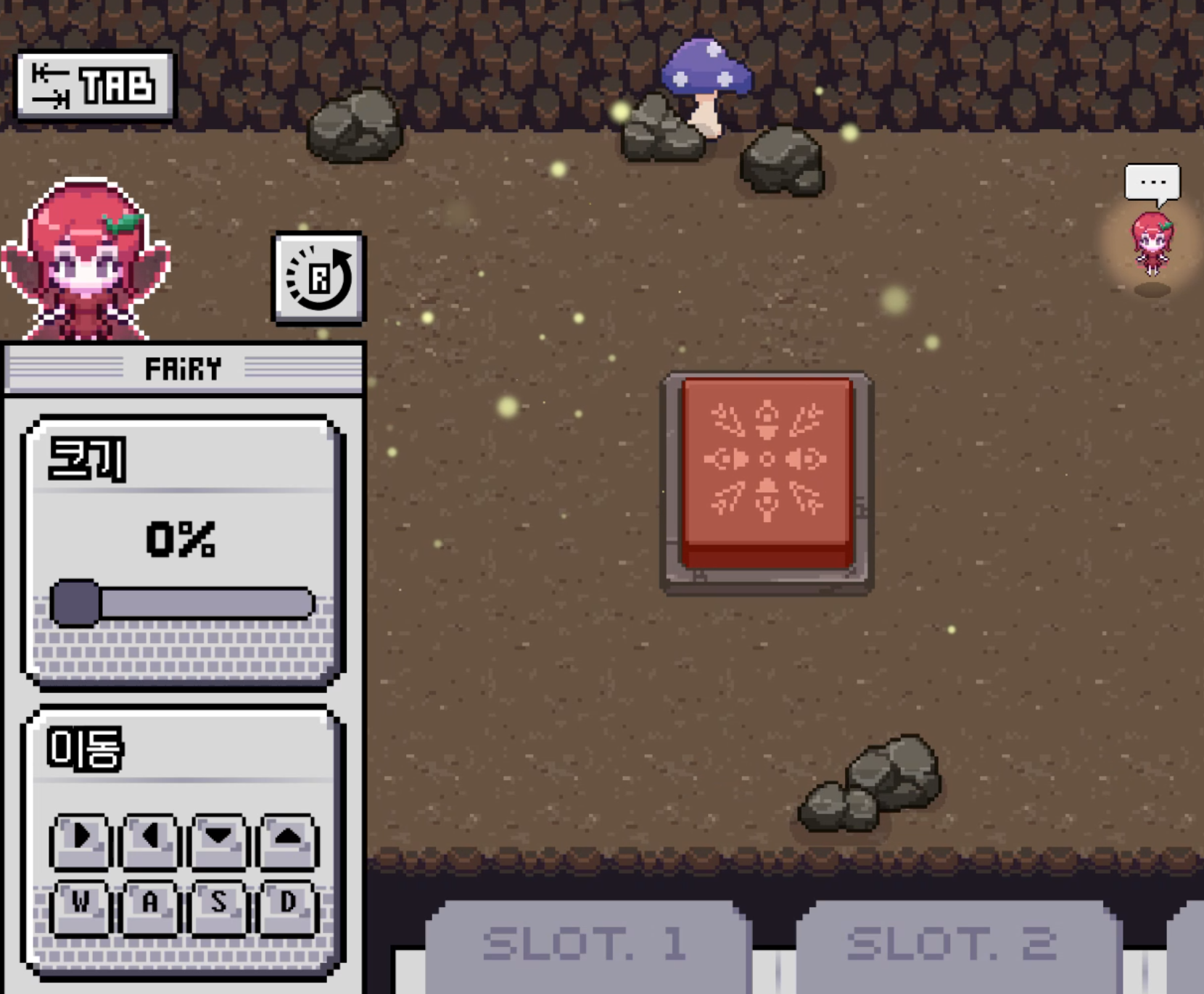 크기 블럭을 플레이어가 장착한 채 크기를 최소치로 줄이면 요정 옆의 작은 통로를 지나갈 수 있다.