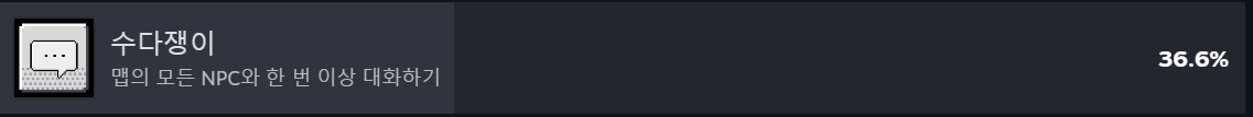 엔딩까지 모든 NPC와 한 번 이상 대화했다면 도전과제 '수다쟁이'가 달성된다.